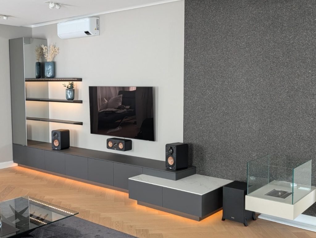 Auch die Integration von Technik spielt eine große Rolle: Fernseher, Soundanlagen, Streaming-Geräte und Konsolen benötigen Platz, der sinnvoll geplant sein will. Wir stimmen die Wohnwand auf Ihre vorhandenen Geräte ab oder berücksichtigen neue Technik, die Sie einbinden möchten. Wenn Sie etwa eine große Soundbar, Lautsprecher oder modernste TV-Technik nutzen, passen wir die Maße millimetergenau an. Zudem stellen wir auf Wunsch Kontakt zu einem Bild- und Tontechniker her und entwickeln gemeinsam ein Wohnwandsystem, das technisch wie optisch aufeinander abgestimmt ist. So erhalten Sie eine Lösung, die perfekt funktioniert und gleichzeitig harmonisch im Raum wirkt.